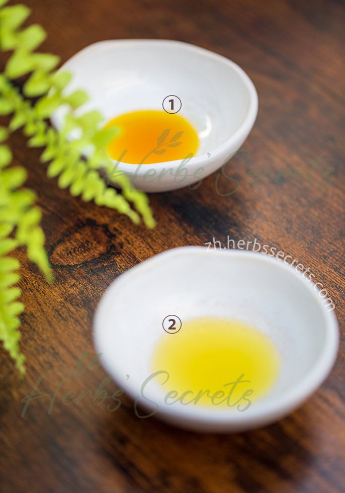 图1: ① 极致冷压黑种草籽油-过滤 ② 普通冷压黑种草籽油-过滤