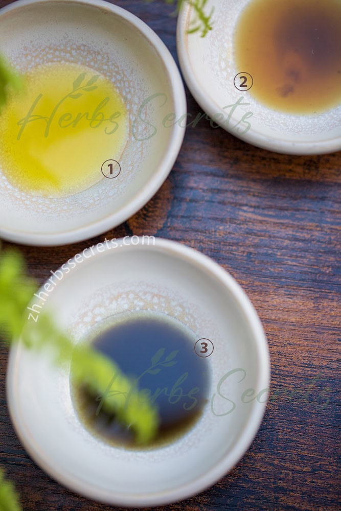 图2: ① 普通冷压黑种草籽油-过滤 ② 普通冷压黑种草籽油-未过滤 ③ 极致冷压黑种草籽油-未过滤