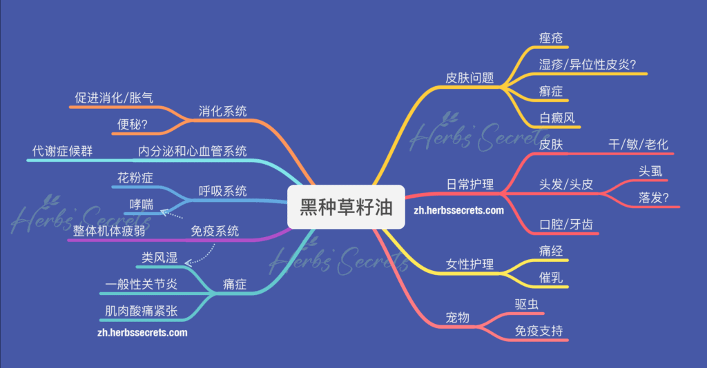 无论是作为一种传统的香料,还是被科学研究定义的保健品或天然药物,「内服」无疑是黑种草籽发挥效用极大化的一个重要途径。尤其是这些年,有关黑种草的植物药理和医学价值研究一直在不断升温,研究的重点除了围绕着核心成分百里醌展开的一些,也不乏基于黑种草籽完整成分(粉剂)或萃取物(植物油、精油等)所进行的探索。目前受关注最多的三个应用领域分别是:「过敏」、「代谢症候群」和「自身免疫性疾病」。