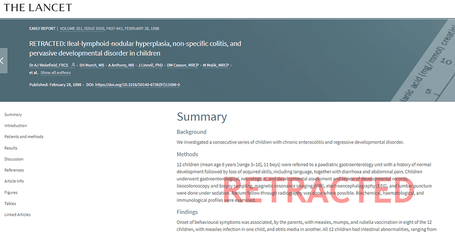 这个论调其实早在1998年,英国医生Andrew Wakefield就有提出,他在著名医学杂志The Lancet(柳叶刀)上发表了一篇论文<Ileal-lymphoid-nodular hyperplasia, non-specific colitis, and pervasive developmental disorder in children>,文章中报道了12名自闭症儿童,其中有8名在注射了MMR疫苗后出现了该症状,他的理论是:麻疹疫苗(MMR之一)会使肠道发炎,导致有害的蛋白质渗入到血液中,最终损害大脑并导致自闭症。然而这篇论文在2010年被《柳叶刀》宣布撤销,原因是有记者爆料论文意图与利益相关,以及杂志认为他的研究具有偶然性。在这期间,也有其他一些科学团队(分别来自丹麦和日本),作了MMR疫苗和自闭症之间关联性的研究。均表示这两者并无直接关联。 [1]