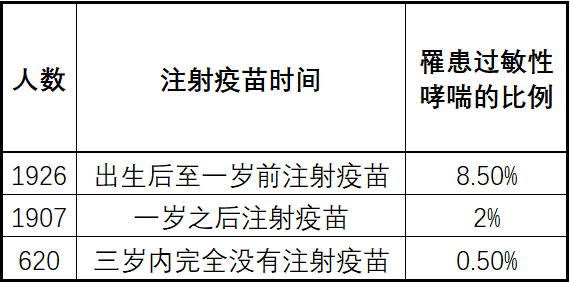 另一项加拿大的研究发现,给两组孩子(样本人数11531)分别接种DPT(百白破三联疫苗),其中一组孩子在三月龄接种,另一组孩子则在五月龄接种,他们成长到七岁时,三月龄组的孩子患上过敏性哮喘的风险比五月龄组的孩子高出一倍。[12]