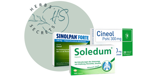 除了蓝胶尤加利精油完整入药,市面上更多的是以桉油醇(Cineol)单体为效用成分的药品。它们的功效与使用完整的蓝胶尤加利胶囊雷同,但有更多不同的剂量区分,以符合不同年龄段使用以及效力程度上有所差异。它们有: