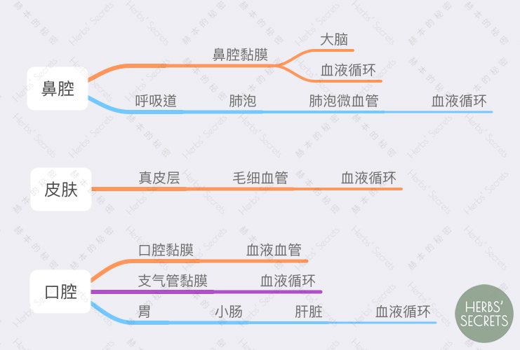 首先我们可以明确,无论精油通过何种路径进入人体,它之所以对人体产生了生理影响(情绪和其它层面的影响在先此暂不讨论),主要原因是它能进入血液,通过全身循环,被分布到全身以及目标器官。但输入途径的差异,会让精油抵达血液的速度和程度有所不同,它们的具体路径如下: