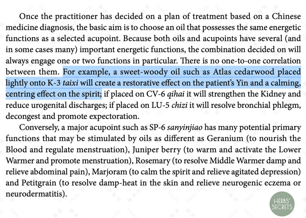 我其实很认同这个方法的逻辑原理,利用精油的能量特性通过经络“输送”从而对人体产生效用,这应该行得通。不过对于具体的操作方式以及精油与穴位的配伍我并不能与作者完全达成共识。如果以同样为能量运作的针灸作为这种精油穴位应用的蓝本,我们或许应该要解决的是如何运用精油匹配每个穴位的穴性,而非与病或症配伍,以及如何从精油的角度来定义「补泻」的功能。尽管Peter Holmes也有提到精油的选取是匹配特定穴位的相同能量,但他理解中的「能量」与「穴性」之间还是有一定差异。以太溪穴为例,它是足少阴经原穴和输穴,五行属土,禀少阴热水之阴精,水中又聚中土之性,水土形成戊癸合化之势,化气以助中土。而这些特性绝不是一个简单的「Yin」(阴性能量)就能概括的。经络有三阴三阳,广义上,三阴经都能对「阴性能量」有所影响。