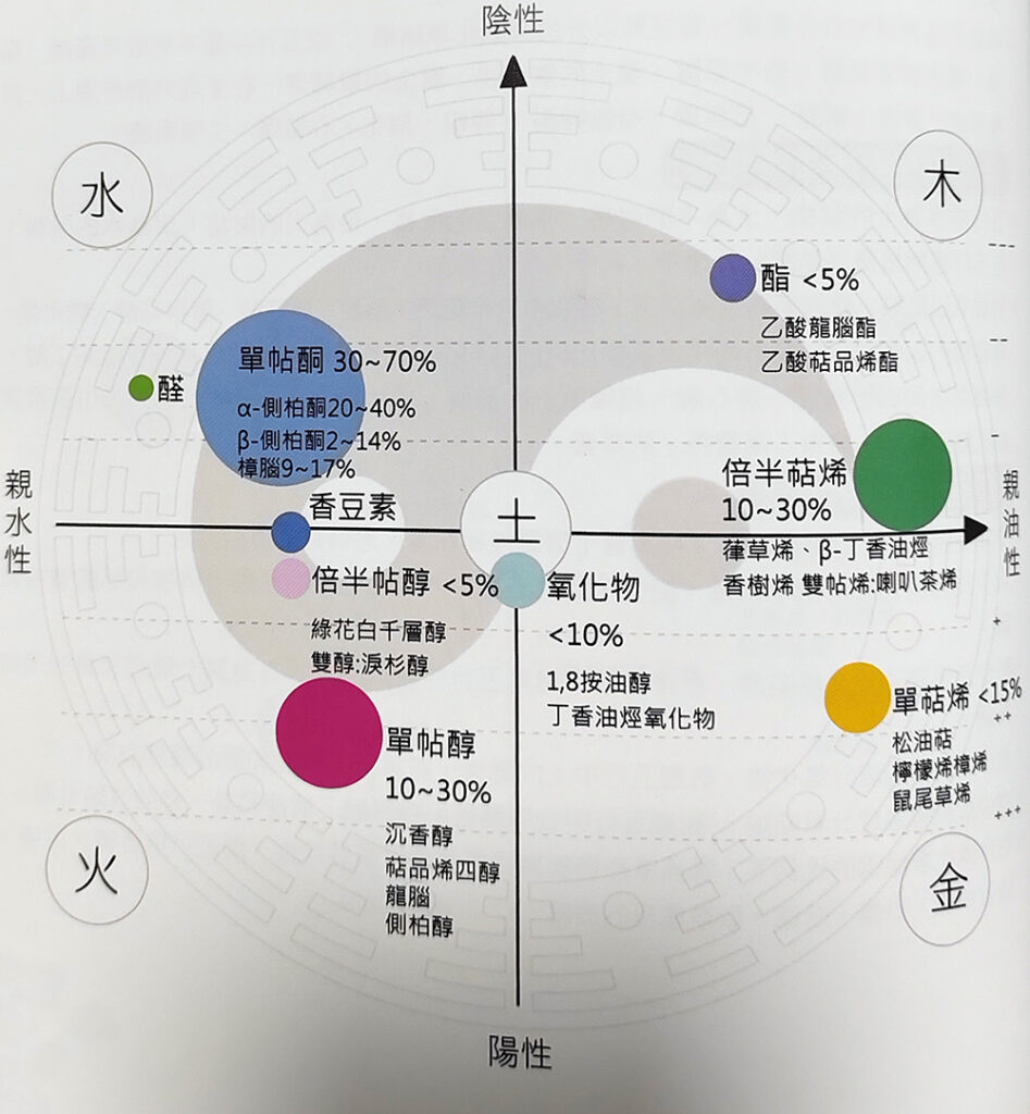 譬如在《易医芳疗》中作者想通过「精油四象限」来做五行的匹配,再以五行与脏腑的对应关系确定每种精油的归经。这算是个曲线救国的思路,但与越抽象的概念匹配,越容易出现考虑不周的地方。例如:作者把「酯类」归于「木」,但事实上「木主升发」,是一种向上、提振的能量,与酯类成分所表现出的安抚镇定显然格格不入;且为什么森林系的精油中都普遍含有高比例的「单萜烯」而非「酯类」?但在书中「单萜烯」匹配的五行却是「金」。我试着揣摩作者的用意,或许是因为单萜烯类精油常常用来处理肺部问题,所以才有了「金」的归属吧。