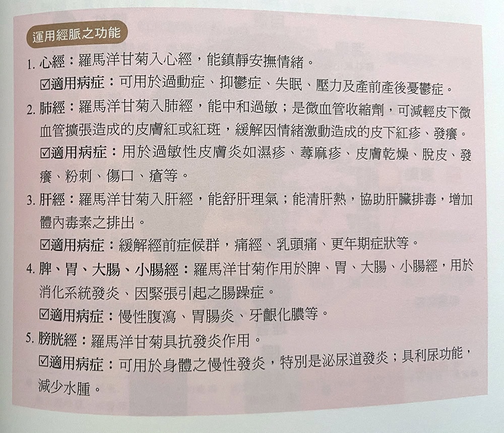 在《快速学会中医芳疗》(简体版名为《经络精油芳疗小百科》)一书中,作者这样归经:罗马洋甘菊归心经,是因为它有安抚镇定情绪的功效;归肺经是因为它可中和过敏,并在各种皮肤问题上有所作为(肺主皮毛),诸如此类。